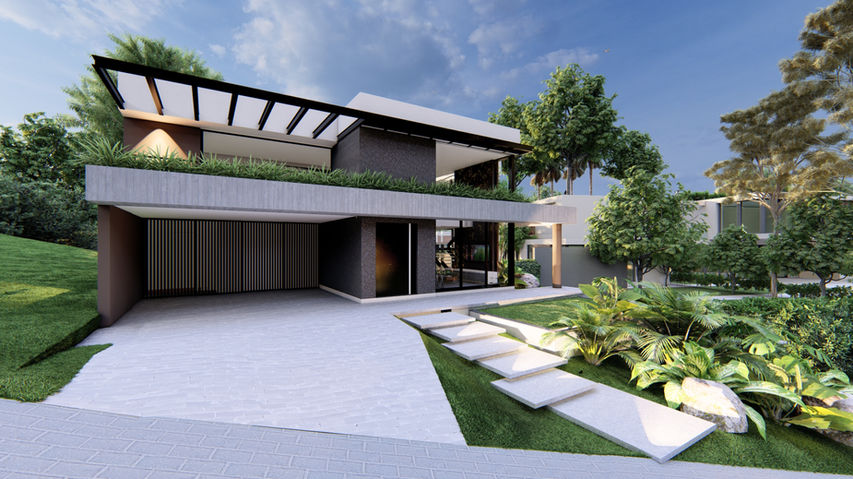 Residência contemporânea com linhas horizontais, volumes bem definidos e forte integração com a área externa, valorizando leveza, transparência e a relação entre arquitetura, paisagem e conforto.